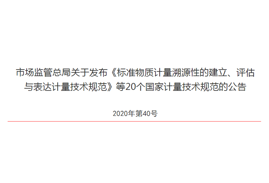 ?2020年9月24日,市場監(jiān)管總局發(fā)布了一則公告,表明根據(jù)《中華人民共和國計量法》有關規(guī)定,正式發(fā)布《標準物質計量溯源性的建立、評估與表達計量技術規(guī)范》等20個國家計量技術規(guī)范。