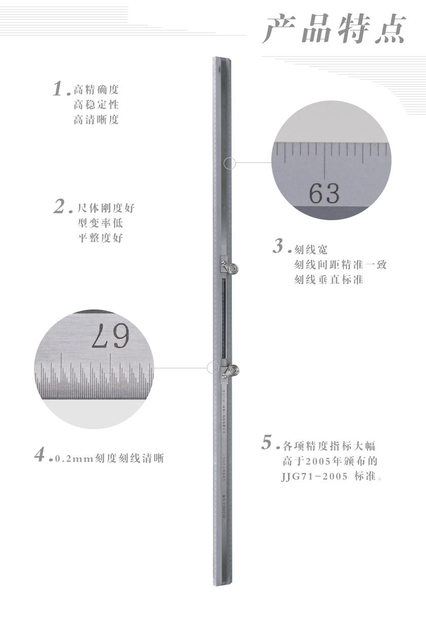 普天同創(chuàng)(深圳)科技有限公司自己主研發(fā)PTTC-ZC1型三等標(biāo)準(zhǔn)金屬線紋尺,作為自主知識產(chǎn)權(quán)的高科技、創(chuàng)新型二十一世紀(jì)新產(chǎn)品,集現(xiàn)代科技、加工中心全自動化制作工藝技術(shù),采用激光刻制刻劃線、標(biāo)選讀數(shù)與圖型。產(chǎn)品具有高精確度、高穩(wěn)定性、高清晰度,刻線寬、刻線間距精準(zhǔn)一致,刻線垂直標(biāo)準(zhǔn),尺體剛度好,型變率低,平整度好,各項(xiàng)精度指標(biāo)大幅高于2005年頒布的JJG71-2005 標(biāo)準(zhǔn)。
