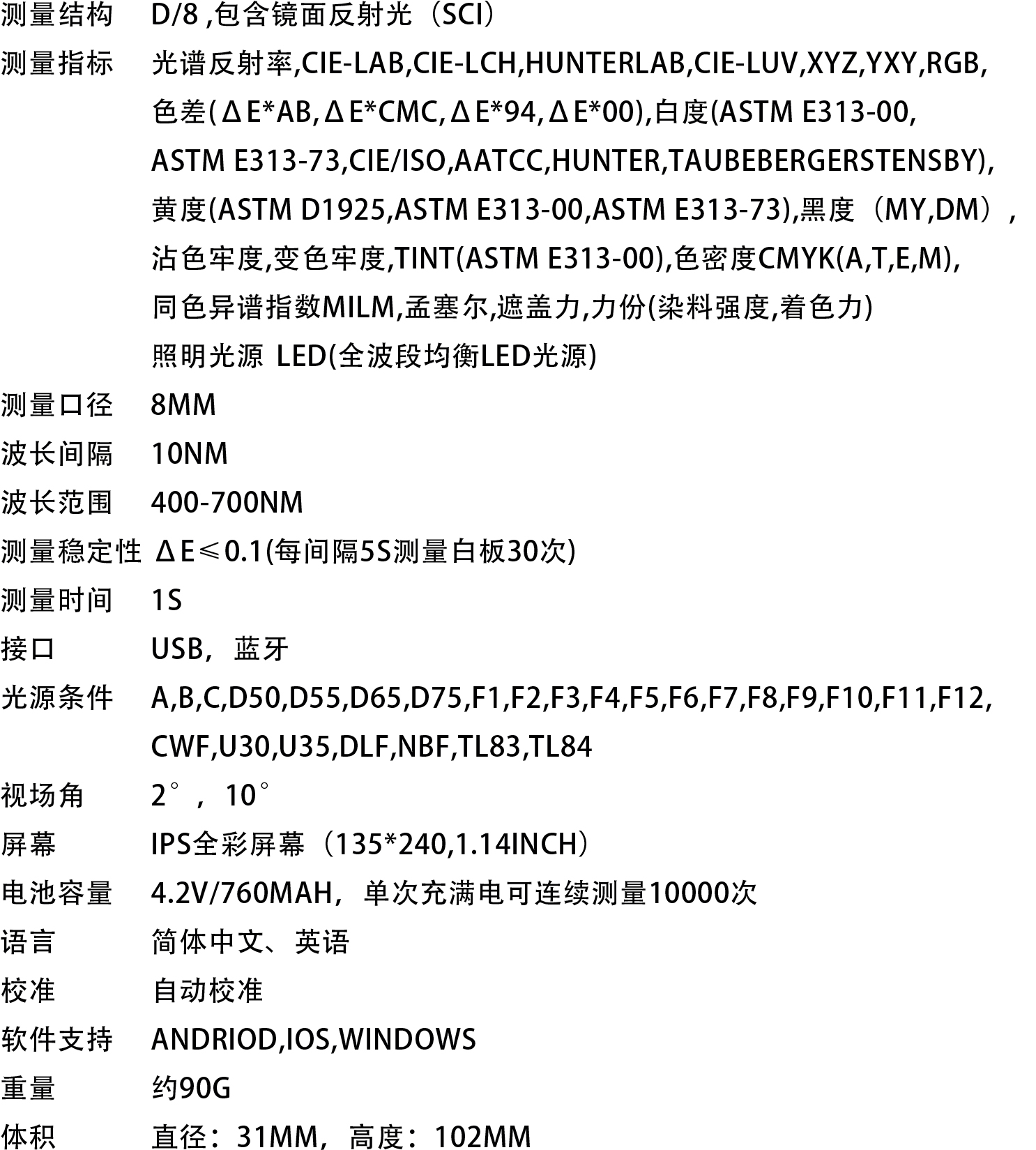 采用國際通用的D/8(積分球漫射照明,8°觀察角),SCI照明觀察條件,測量更準(zhǔn)確;