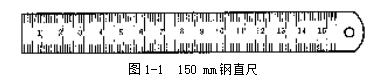 鋼直尺是最簡(jiǎn)單的長(zhǎng)度量具,它的長(zhǎng)度有150,300,500和1000 mm四種規(guī)格。圖1-1是常用的150 mm鋼直尺。