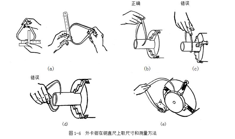 用巳在鋼直尺上取好尺寸的外卡鉗去測(cè)量外徑時(shí),要使兩個(gè)測(cè)量面的聯(lián)線垂直零件的軸線,靠外卡鉗的自重滑過零件外圓時(shí),我們手中的感覺應(yīng)該是外卡鉗與零件外圓正好是點(diǎn)接觸,此時(shí)外卡鉗兩個(gè)測(cè)量面之間的距離,就是被測(cè)零件的外徑。所以,用外卡鉗測(cè)量外徑,就是比較外卡鉗與零件外圓接觸的松緊程度,如圖1-6(b)以卡鉗的自重能剛好滑下為合適。如當(dāng)卡鉗滑過外圓時(shí),我們手中沒有接觸感覺,就說明外卡鉗比零件外徑尺寸大,如靠外卡鉗的自重不能滑過零件外圓,就說明外卡鉗比零件外徑尺寸小。切不可將卡鉗歪斜地放上工件測(cè)量,這樣有誤差。圖1-6(c) 所示。由于卡鉗有彈性,把外卡鉗用力壓過外圓是錯(cuò)誤的,更不能把卡鉗橫著卡上去,圖1-6(d) 所示。對(duì)于大尺寸的外卡鉗,靠它自重滑過零件外圓的測(cè)量壓力已經(jīng)太大了,此時(shí)應(yīng)托住卡鉗進(jìn)行測(cè)量,圖1-6(e)所示。