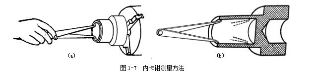 用內(nèi)卡鉗測量內(nèi)徑時,應(yīng)使兩個鉗腳的測量面的聯(lián)線正好垂直相交于內(nèi)孔的軸線,即鉗腳的兩個測量面應(yīng)是內(nèi)孔直徑的兩端點。因此,測量時應(yīng)將下面的鉗腳的測量面停在孔壁上作為支點(圖1-7a),上面的鉗腳由孔口略往里面一些逐漸向外試探,并沿孔壁圓周方向擺動,當沿孔壁圓周方向能擺動的距離為最小時,則表示內(nèi)卡鉗腳的兩個測量面已處于內(nèi)孔直徑的兩端點了。再將卡鉗由外至里慢慢移動,可檢驗孔的圓度公差,圖1-7b 所示。