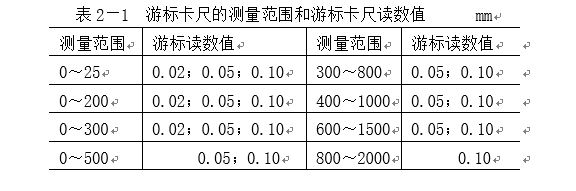 目前我國生產(chǎn)的游標(biāo)卡尺的測量范圍及其游標(biāo)讀數(shù)值見表2-1。