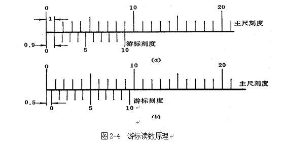 如圖2―4(a)所示,主尺刻線間距(每格)為1mm,當(dāng)游標(biāo)零線與主尺零線對準(zhǔn)(兩爪合并)時,游標(biāo)上的第10刻線正好指向等于主尺上的9mm,而游標(biāo)上的其他刻線都不會與主尺上任何一條刻線對準(zhǔn)。