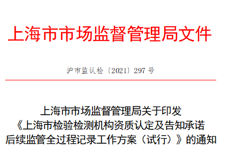 5月24日,上海市市場監(jiān)管局發(fā)布《上海市檢驗檢測機構資質認定及告知承諾后續(xù)監(jiān)管全過程記錄工作方案(試行)》?!豆ぷ鞣桨福ㄔ囆校诽岢觯虾J袡z驗檢測機構資質認定所有審批事項(包括首次、復查、擴項、變更)及告知承諾后續(xù)監(jiān)管實施全過程記錄。其中,對上海市檢驗檢測機構資質認定現(xiàn)場評審及告知承諾后續(xù)監(jiān)管現(xiàn)場檢查實施全程音像記錄。