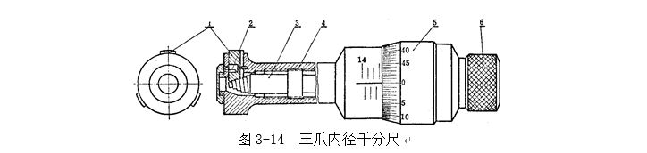 三爪內(nèi)徑千分尺的工作原理,圖3-14為測量范圍11~14mm的三爪內(nèi)徑千分尺,當順時針旋轉測力裝置6時,就帶動測微螺桿3旋轉,并使它沿著螺紋軸套4的螺旋線方向移動,于是測微螺桿端部的方形圓錐螺紋就推動三個測量爪1作徑向移動。扭簧2的彈力使測量爪緊緊地貼合在方形圓錐螺紋上,并隨著測微螺桿的進退而伸縮。