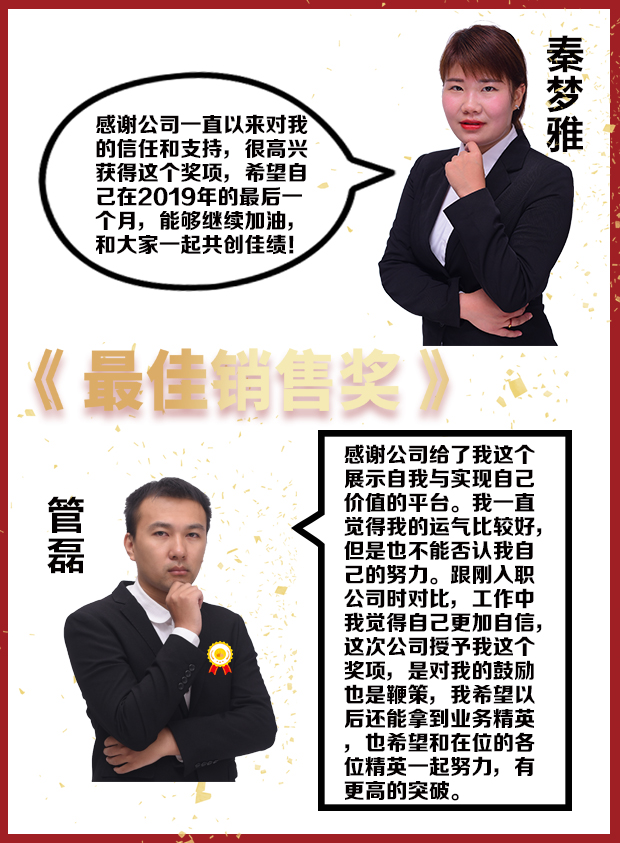 全體員工合唱普天之歌,拉開此次表彰大會(huì)序幕。岳總經(jīng)理向業(yè)務(wù)一部秦夢(mèng)雅和業(yè)務(wù)二部管磊表示祝賀及感謝,兩位業(yè)務(wù)精英也發(fā)表了自己的獲獎(jiǎng)感言。