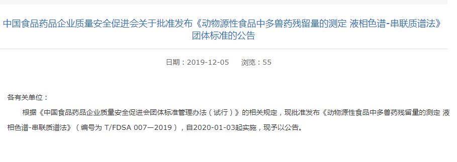 近日,中國(guó)食品藥品企業(yè)質(zhì)量安全促進(jìn)會(huì)發(fā)布了關(guān)于《動(dòng)物源性食品中多獸藥殘留量的測(cè)定 液相色譜-串聯(lián)質(zhì)譜法》團(tuán)體標(biāo)準(zhǔn)的公告。公告中稱,該標(biāo)準(zhǔn)將于2020年1月3號(hào)正式實(shí)施。
