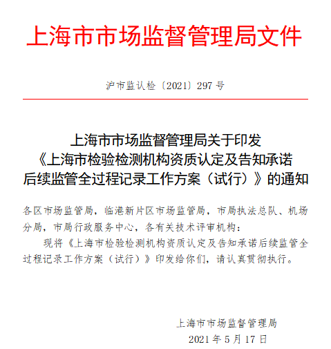 上海市檢驗(yàn)檢測(cè)機(jī)構(gòu)資質(zhì)認(rèn)定及告知承諾后續(xù)監(jiān)管全過(guò)程記錄工作方案(試行)