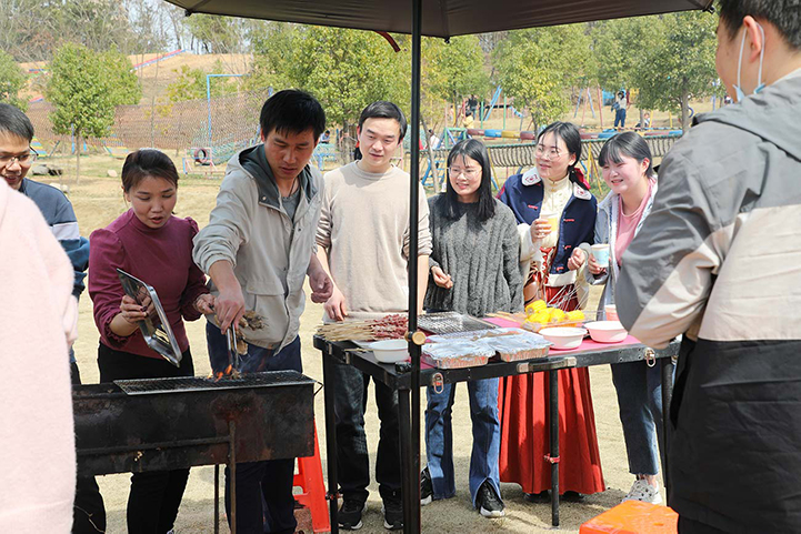 滋啦滋啦冒著汁兒的烤肉、咕嘟咕嘟的柴火雞、花樣繁多的蔬菜和肉串,隨著春風(fēng)的光顧,總是不時傳來讓人垂涎欲滴的香味,大家已經(jīng)迫不及待地想要品嘗這些美味了。酒足飯飽之后,娛樂活動更是不可少的,撲克牌、蕩秋千、平衡木,各種各樣的娛樂設(shè)施上都有大家的身影,一片歡聲笑語中,美好的一天就度過了。