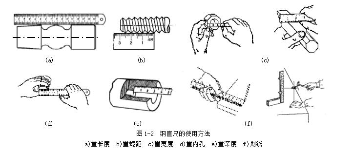鋼直尺用于測(cè)量零件的長(zhǎng)度尺寸(圖1-2),它的測(cè)量結(jié)果不太準(zhǔn)確。這是由于鋼直尺的刻線間距為1mm,而刻線本身的寬度就有0.1~0.2mm,所以測(cè)量時(shí)讀數(shù)誤差比較大,只能讀出毫米數(shù),即它的最小讀數(shù)值為1mm,比1mm小的數(shù)值,只能估計(jì)而得。