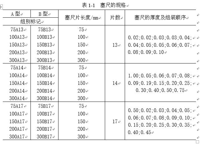 塞尺又稱厚薄規(guī)或間隙片。主要用來檢驗機(jī)床特別緊固面和緊固面、活塞與氣缸、活塞環(huán)槽和活塞環(huán)、十字頭滑板和導(dǎo)板、進(jìn)排氣閥頂端和搖臂、齒輪嚙合間隙等兩個結(jié)合面之間的間隙大小。塞尺是由許多層厚薄不一的薄鋼片組成(圖1-10)按照塞尺的組別制成一把一把的塞尺,每把塞尺中的每片具有兩個平行的測量平面,且都有厚度標(biāo)記,以供組合使用。