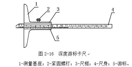深度游標卡尺如圖2-16所示,用于測量零件的深度尺寸或臺階高低和槽的深度。它的結(jié)構特點是尺框3的兩個量爪連成一起成為一個帶游標測量基座1,基座的端面和尺身4的端面就是它的兩個測量面。如測量內(nèi)孔深度時應把基座的端面緊靠在被測孔的端面上,使尺身與被測孔的中心線平行,伸入尺身,則尺身端面至基座端面之間的距離,就是被測零件的深度尺寸。它的讀數(shù)方法和游標卡尺完全一樣。