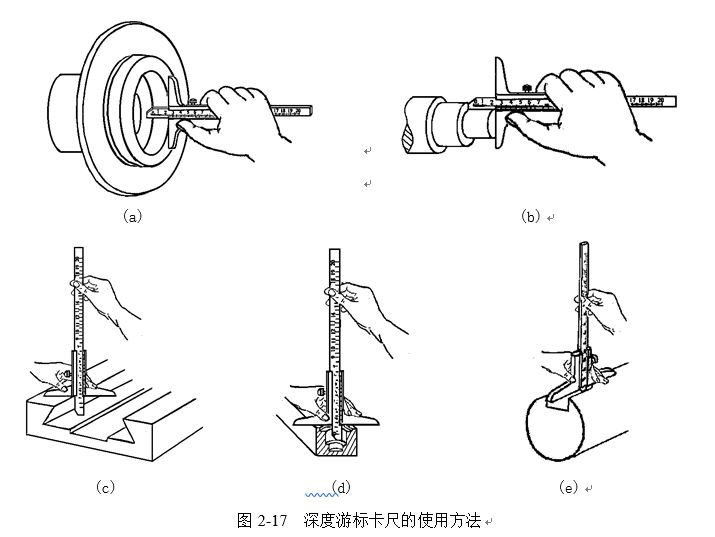 測量時,先把測量基座輕輕壓在工件的基準面上,兩個端面必須接觸工件的基準面,圖2-17(a) 所示。測量軸類等臺階時,測量基座的端面一定要壓緊在基準面,圖2-17(b)(c) 所示,再移動尺身,直到尺身的端面接觸到工件的量面(臺階面)上,然后用緊固螺釘固定尺框,提起卡尺,讀出深度尺寸。多臺階小直徑的內(nèi)孔深度測量,要注意尺身的端面是否在要測量的臺階上,圖2-17(d) 。當基準面是曲線時,圖2-17(e) ,測量基座的端面必須放在曲線的最高點上,測量出的深度尺寸才是工件的實際尺寸,否則會出現(xiàn)測量誤差。